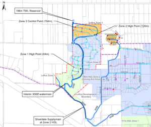 The servicing plan was created with consideration to future pressure zoning as proposed by the Silverdale Comprehensive Planning Area (SCPA) which plans for an eventual permanent transmission main from Abbotsford to Mission. Water Street completed preliminary sizing for a reservoir and various PRVs and pump stations required for the development’s water servicing. The impacts of the proposed development’s demands and required water system changes were modelled and analyzed using Innovyze’s InfoWater software.